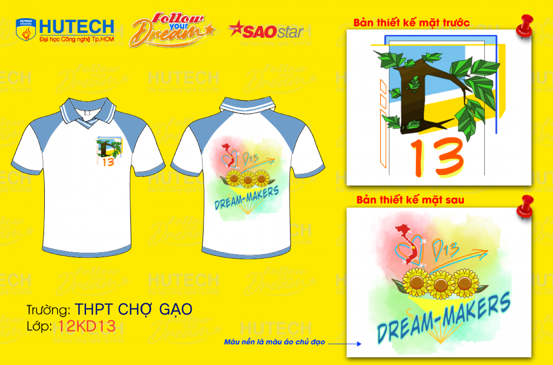 Màu sắc: Trắng Slogan: Dream- Markers Mô tả: Lời nói đầu tiên xin cho phép tập thể 12KD13 chân thành cảm ơn Trường Đại học Công nghệ TPHCM (Hutech) đã tổ chức cho chúng em một sân chơi vui tươi, bổ ích và ý nghĩa. Và xin cảm ơn mọi người đã bỏ ra thời gian quý báu của mình để đến với bài dự thi của tập thể chúng em. Sau đây, em xin đại diện cho tập thể lớp trình bày ý tưởng áo lớp của mình. Chiếc áo được lấy phông nền màu trắng làm chủ đạo như một sự khởi đầu, là những thứ đầu tiên nhất. Màu trắng còn là biểu tượng cho sự hồn nhiên, trong sáng, giản dị và tinh khiết của tuổi học trò đầy ngây thơ. Nổi bậc lên đó là hình ảnh xanh tươi của cây dương_ cái hồn của trường em, được cách điệu hóa độc đáo tạo thành chữ D tượng trưng cho khối lớp (KD). Tổng thể logo áo là một góc nhìn qua khung cửa sổ, nền xanh của logo thể hiện bầu trời trong trẻo cũng là nơi chất chứa bao ước mơ, hoài bão của muôn người. Kế đó, nền màu vàng là ánh nắng rực rỡ của nhựa sống, sự hân hoan, phấn khởi và là cả sự nhiệt huyết của tuổi trẻ. Cả mặt trước của áo là biểu tượng cho cái chung nhất, đó là trường THPT Chợ Gạo, là nhóm kết nghĩa KD13, là ngôi nhà thứ 2 của mỗi cá nhân 12KD13. Lấy cảm hứng từ chủ đề "Follow Your Dreams"_ "Theo đuổi giấc mơ của bạn", chúng em mang đến cho cuộc thi một màu sắc tươi sáng của tuổi học trò với slogan "Dream- Makers"_"Những người làm nên ước mơ" cùng với biểu tượng quen thuộc là hoa hướng dương nhưng đầy ý nghĩa kết hợp với dáng hình chữ S của đất nước thân yêu. Hoa hướng dương là hình ảnh được cách điệu hóa tượng trưng cho mỗi cá nhân của 12KD13. Nếu như hoa hướng dương một lòng hướng về mặt trời rạng ngời thì 12KD13 chúng em luôn hướng tới những giấc mơ cháy bỏng để theo đuổi, chinh phục và sống hết mình vì nó. Cụ thể đó là ước mơ đỗ đại học, vào được ngôi trường mà mình hằng mong. Từ đó rèn luyện bản thân, trau dồi kiến thức góp phần xây dựng đất nước ngày càng giàu đẹp, văn minh, tiến bộ hơn, mang Việt Nam vươn xa, vươn cao ra thế giới. Cuối cùng, tập thể 12KD13 xin chúc cuộc thi thiết kế áo lớp Hutech 2021 thành công tốt đẹp, chúc mọi người luôn vui khỏe để thực hiện giấc mơ của mình.
