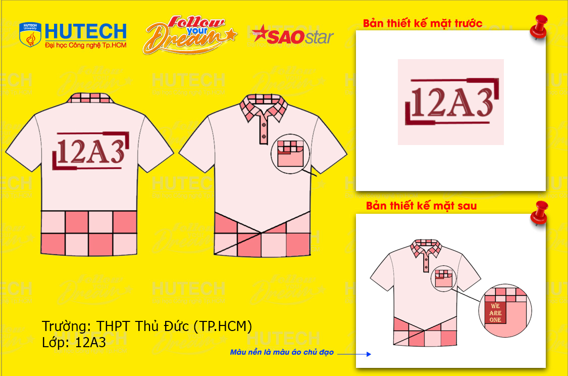 Màu sắc: màu hồng đỏ Slogan: We are one Mô tả: Chiếc áo có màu sắc hài hòa với phông màu hồng đỏ toát lên sự hạnh phúc và hơi thơ mộng của tuổi trẻ. Tiếp đến là dòng chữ trên chiếc túi ngực trái, dòng chữ “We are one”- tức chúng tôi là một muốn nói lên sự đoàn kết , kề vai sát cánh của tập thể lớp 12A3, cùng một mục đích học tập, cùng một quyết tâm xây dựng tập thể lớp ngày càng đi lên. Bên cạnh đó, nổi bật không kém chính là họa tiết carô trên áo được lấy ý tưởng từ áo đồng phục học sinh đã đồng hành cùng chúng em 3 năm nay, là kỉ niệm khó quên và đáng nhớ của tuổi học sinh.
