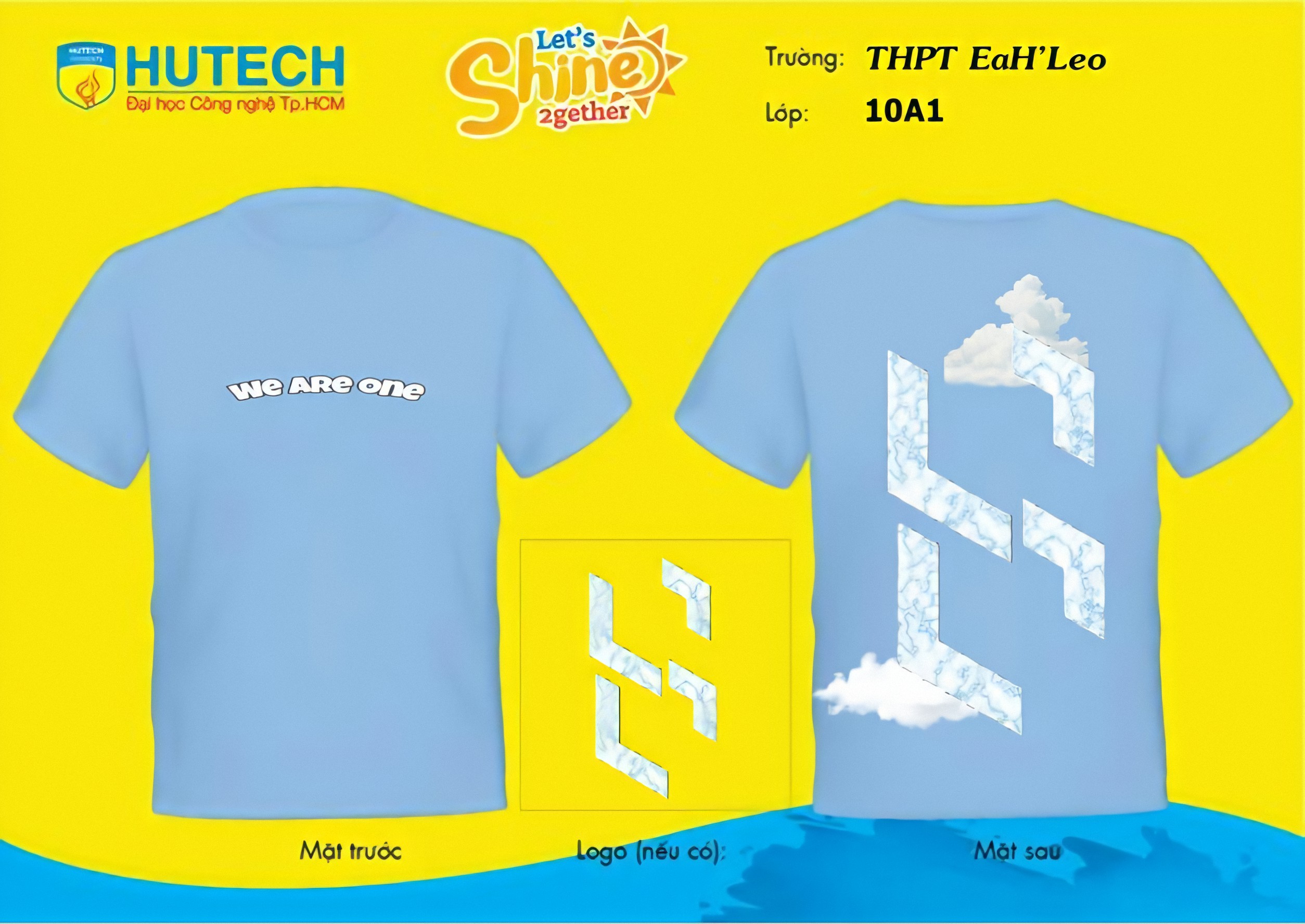 Màu sắc: Baby Blue Slogan: We are one Mô tả: Xin chào tất cả mọi người! Lớp chúng em mang đến đây một bộ áo lớp được thiết kế đơn giản với tông màu "Baby Blue" - là hơi thở của em bé là biểu tượng của tình yêu lâu dài. Chính vì thế chúng em chọn màu sắc này để khi mang lên áo này chúng em có một tình bạn thật là lâu dài. Phía sau áo là logo lớp cũng lấy tông màu xanh - kết hợp những đám mấy trắng . Đằng trước là Slogan: "We are one" - thể hiện tinh thần đoàn kết, gắn chặt giữa các thành viên trong lớp!