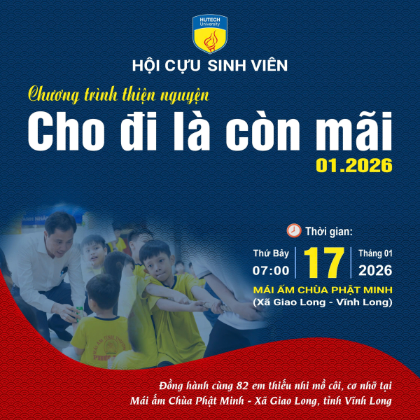 Với tinh thần sẻ chia và trách nhiệm xã hội, chương trình thiện nguyện “Cho đi là còn mãi” là hoạt động thường niên do Hội Cựu sinh viên HUTECH phối hợp CLB Doanh nhân HUTECH tổ chức, hướng đến việc lan tỏa những giá trị nhân văn bền vững thông qua hành động thiết thực.