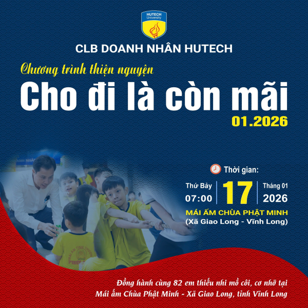 Với tinh thần sẻ chia và trách nhiệm xã hội, chương trình thiện nguyện “Cho đi là còn mãi” là hoạt động thường niên do Hội Cựu sinh viên HUTECH phối hợp CLB Doanh nhân HUTECH tổ chức, hướng đến việc lan tỏa những giá trị nhân văn bền vững thông qua hành động thiết thực.