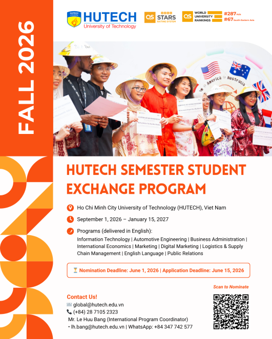 The Department of International Relations and Project Management, Ho Chi Minh City University of Technology (HUTECH), is pleased to announce the Semester Exchange Programs for students in the second semester of the...