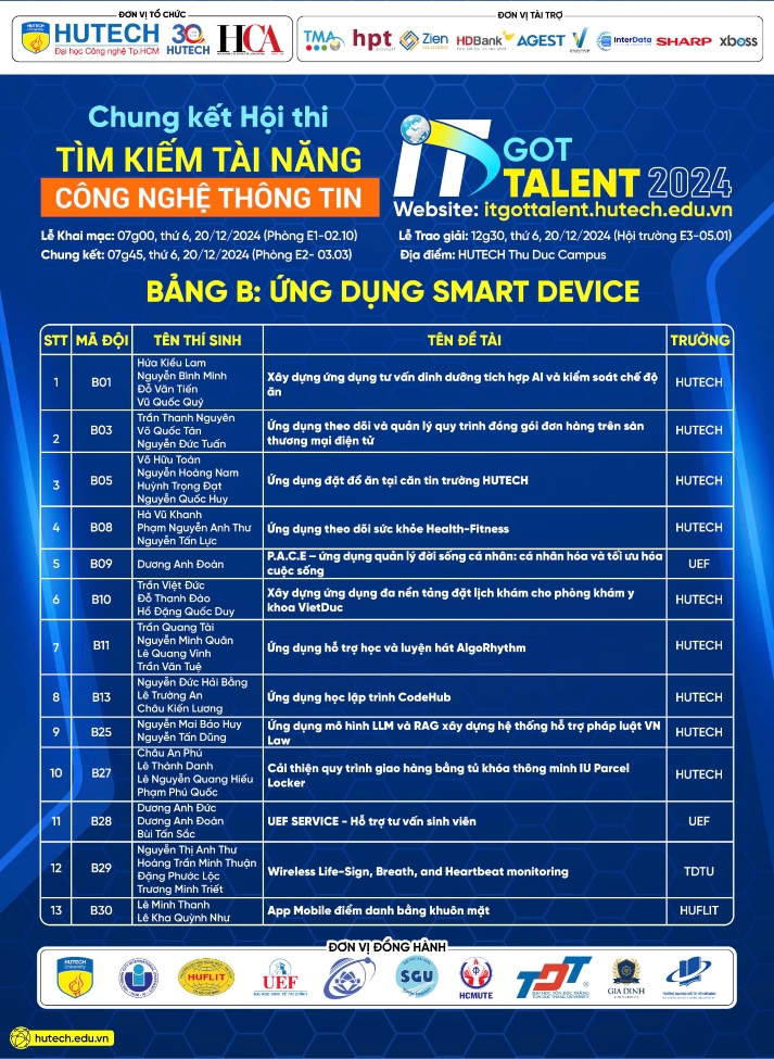 Lễ khai mạc sẽ diễn ra vào lúc 7h00 ngày 20/12 tại phòng E1-02.10 và Chung kết sẽ bắt đầu lúc 7h45 tại phòng E2-03.03. Hội thi năm nay thu hút 189 đội với 451 thí sinh đăng ký dự thi, với 6 bảng thi đa dạng, bao gồm: An toàn thông tin; Ứng dụng Smart Device; Ứng dụng Website; Ứng dụng AI, IoT, Blockchain & Game; Mạng máy tính; Học máy và Ứng dụng. Sau khi trải qua vòng đầu, 159 đội với 357 thí sinh tiếp tục tranh tài gay cấn tại vòng Bán kết được tổ chức từ 12-15/12 vừa qua. Vượt qua nhiều đối thủ, 77 dự án nổi bật đến từ 202 thí sinh tài năng của HUTECH và 11 trường đại học khác trên toàn quốc như ĐH Công nghệ thông tin - ĐHQG TP.HCM, ĐH Quốc tế - ĐHQG TP.HCM, ĐH Sư phạm Kỹ thuật TP.HCM,… sẽ bước tiếp vào vòng Chung kết. Các đội thi sẽ trình bày, bảo vệ dự án và thể hiện khả năng sáng tạo, ứng dụng công nghệ trước hội đồng Ban giám khảo.