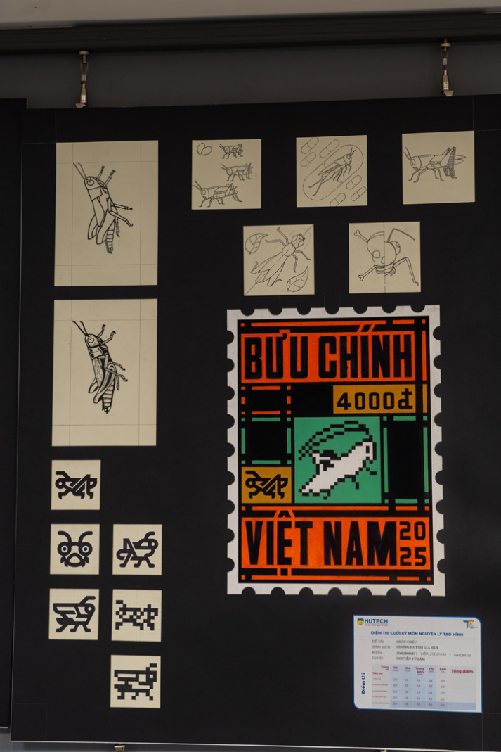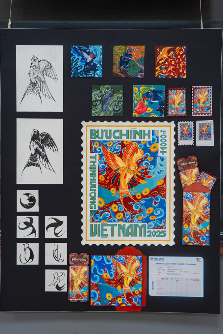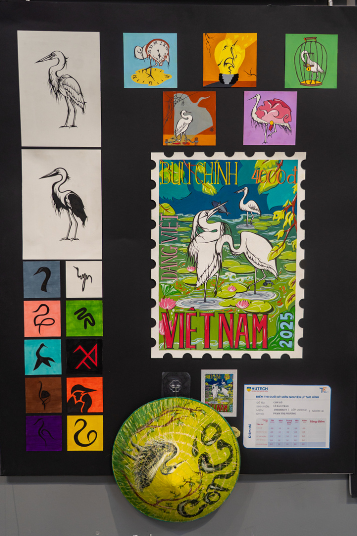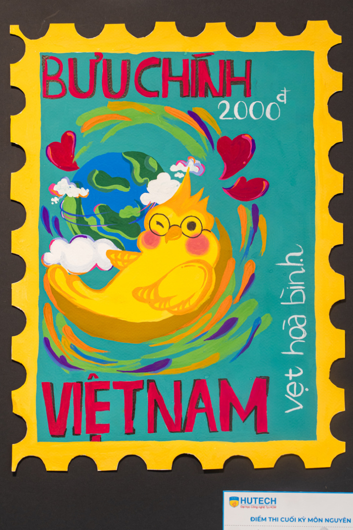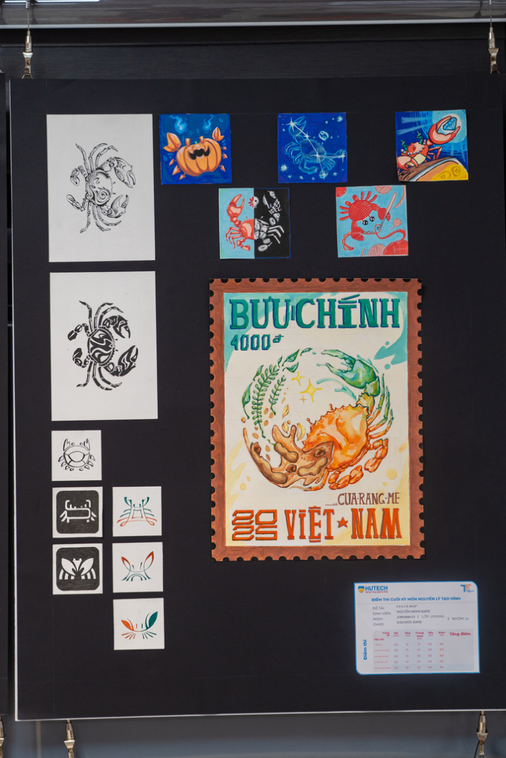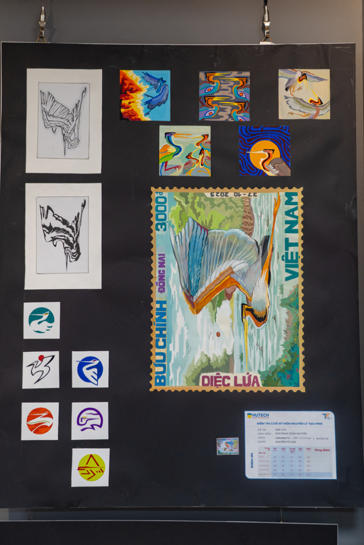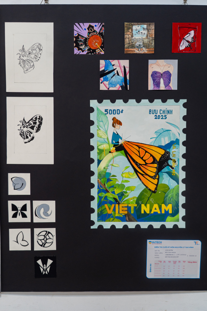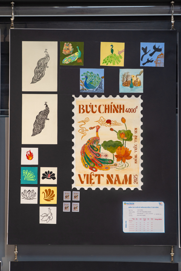 Với chủ đề “Thiên nhiên Việt Nam”, các tác phẩm trưng bày là những bộ thiết kế tem bưu chính khai thác chất liệu từ môi trường tự nhiên, từ cây cỏ hoa lá đến chim muông hay núi rừng sông biển. Sinh viên được yêu cầu vận dụng các nguyên lý tạo hình cơ bản như cân bằng, tương phản, nhịp điệu, trọng tâm và hài hòa để chuyển hóa kiến thức lý thuyết thành ngôn ngữ thiết kế giàu cảm xúc và truyền đạt ý tưởng trực quan. Những nguyên lý này không chỉ giúp bố cục sản phẩm trở nên cân đối, sinh động mà còn đúng với yêu cầu của tem - một hình thức thiết kế vừa mang tính nghệ thuật vừa mang tính ứng dụng cao.