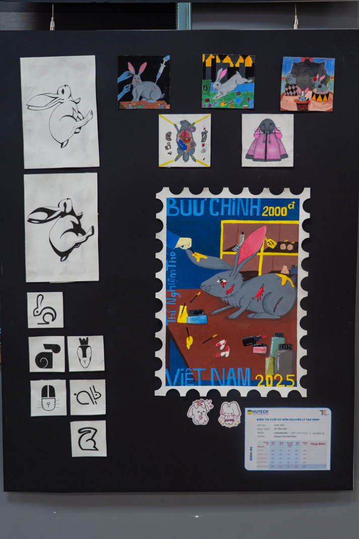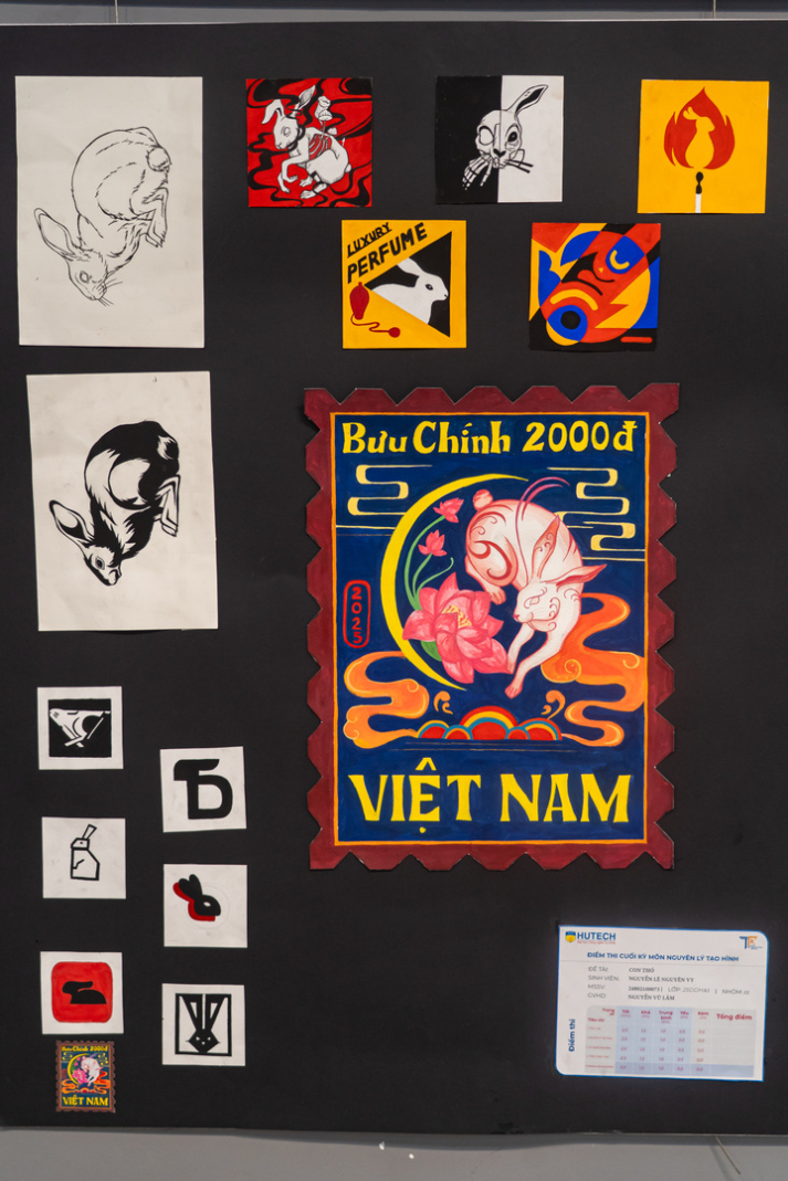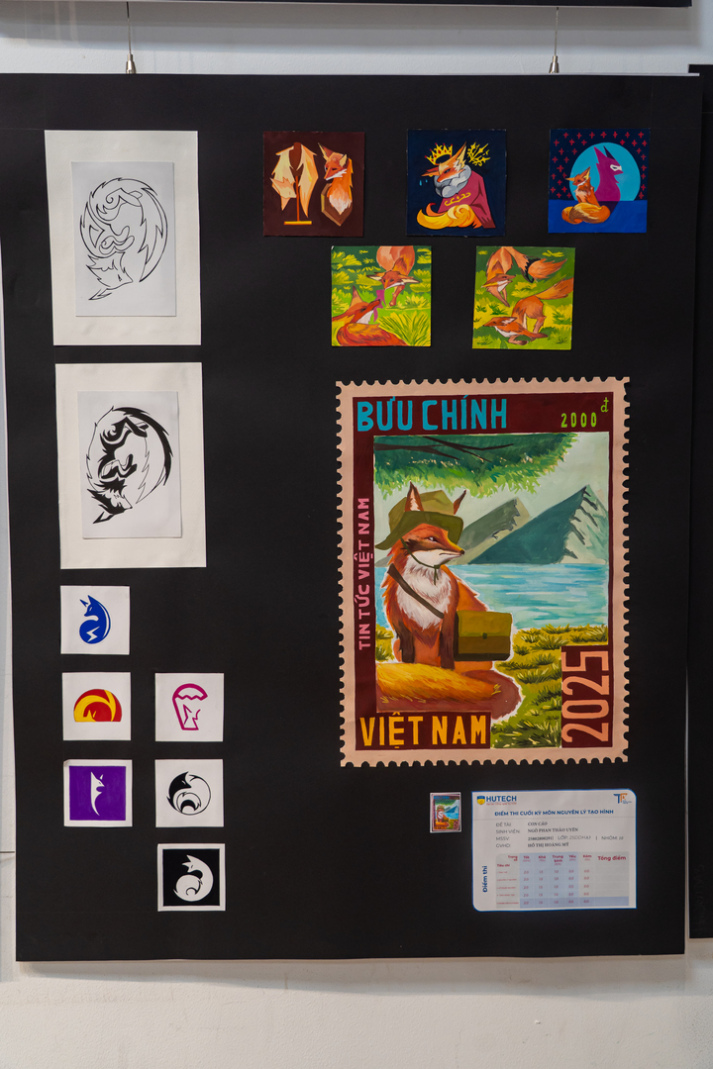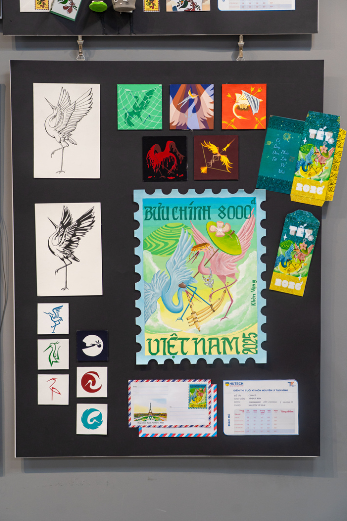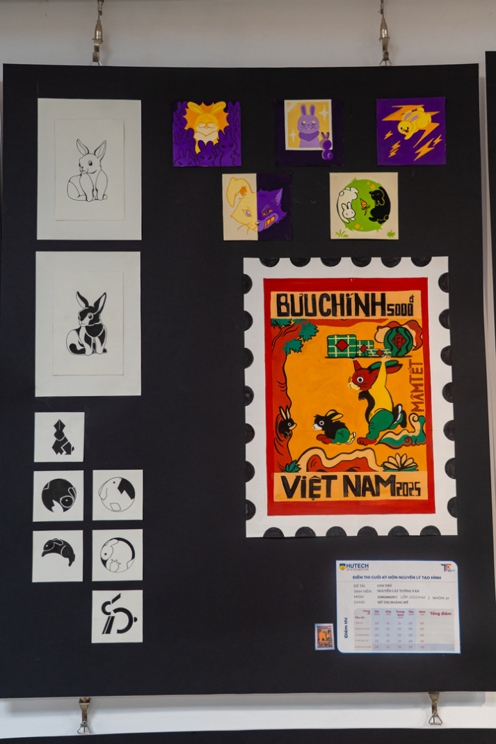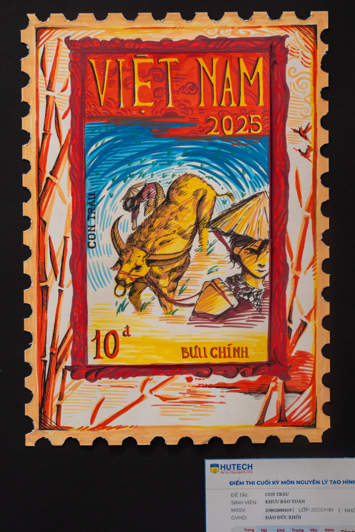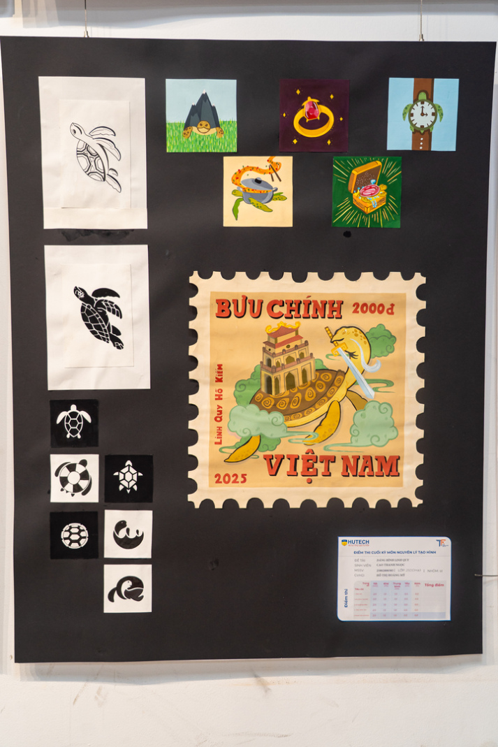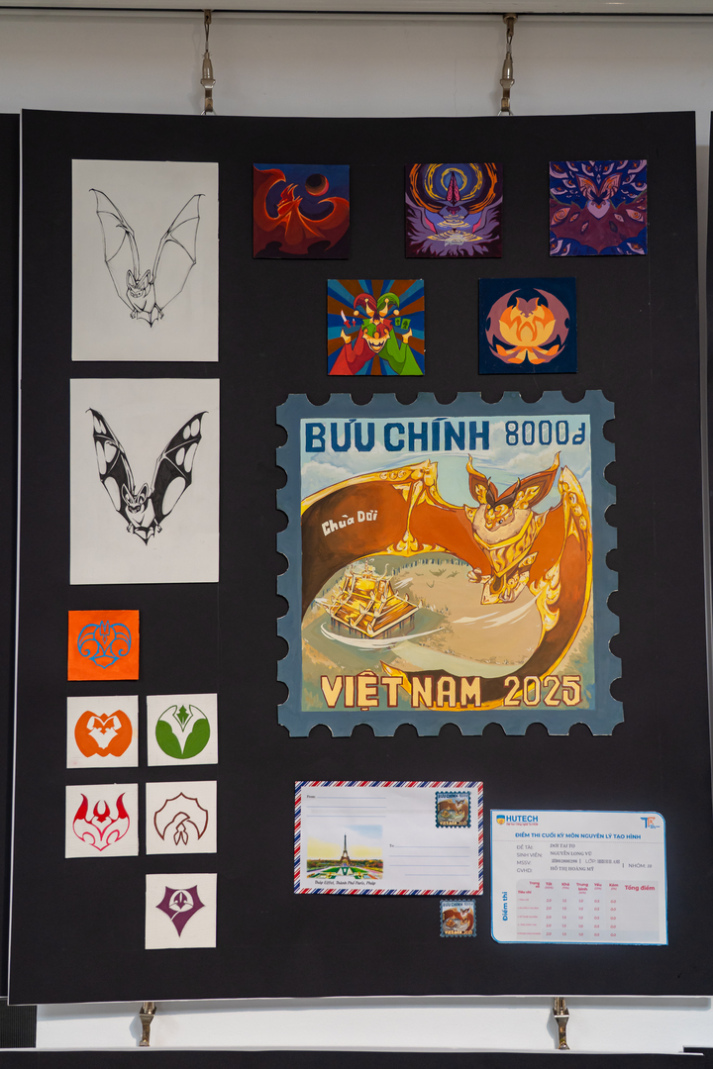 Với chủ đề “Thiên nhiên Việt Nam”, các tác phẩm trưng bày là những bộ thiết kế tem bưu chính khai thác chất liệu từ môi trường tự nhiên, từ cây cỏ hoa lá đến chim muông hay núi rừng sông biển. Sinh viên được yêu cầu vận dụng các nguyên lý tạo hình cơ bản như cân bằng, tương phản, nhịp điệu, trọng tâm và hài hòa để chuyển hóa kiến thức lý thuyết thành ngôn ngữ thiết kế giàu cảm xúc và truyền đạt ý tưởng trực quan. Những nguyên lý này không chỉ giúp bố cục sản phẩm trở nên cân đối, sinh động mà còn đúng với yêu cầu của tem - một hình thức thiết kế vừa mang tính nghệ thuật vừa mang tính ứng dụng cao.