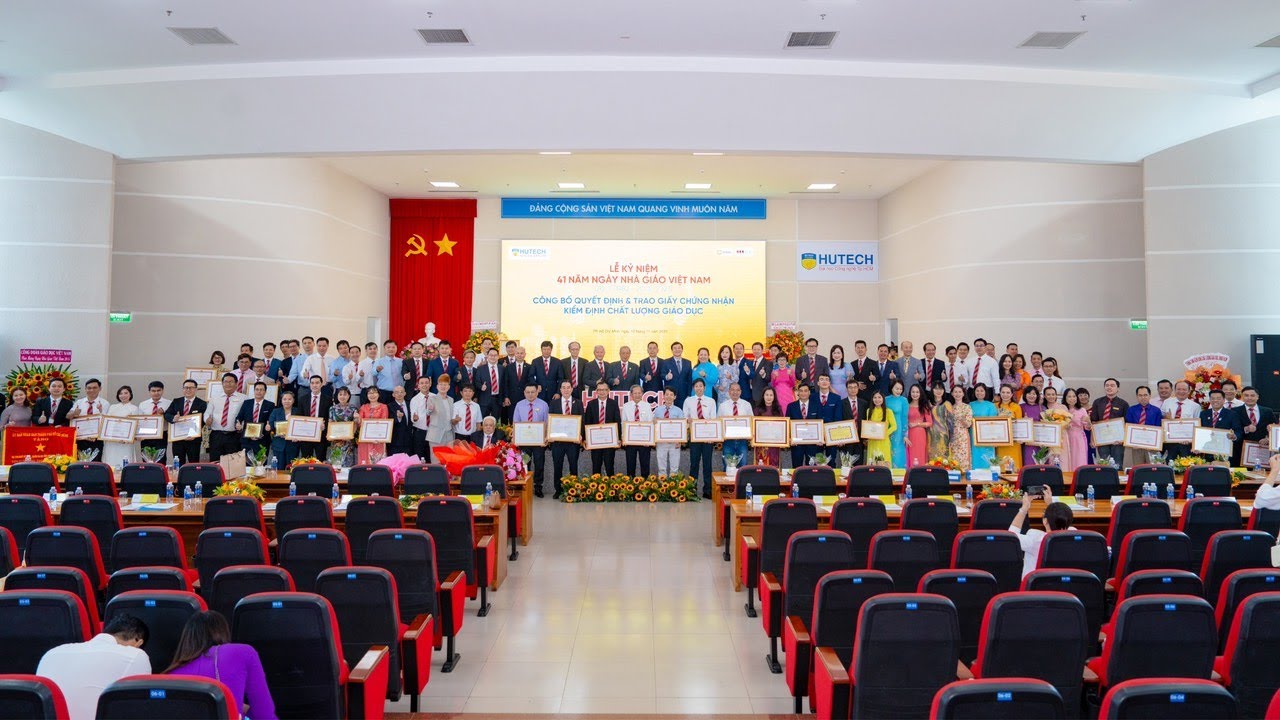 Ngày 18/11, Trường Đại học Công nghệ TP.HCM (HUTECH) long trọng tổ chức Lễ kỷ niệm 41 năm Ngày Nhà giáo Việt Nam (20/11/1982 - 20/11/2023), công bố quyết định và trao chứng nhận kiểm định chất lượng giáo dục tại Thu Duc Campus. Đây cũng là dịp để Nhà trường tuyên dương, khen thưởng cho các tập thể, cá nhân có thành tích xuất sắc trong năm học vừa qua.
