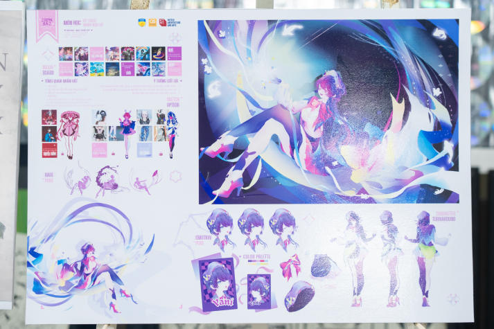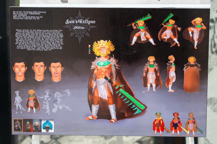 Sinh viên Nguyễn Dương Hoàng Khang với tác phẩm “Horn 13” chọn bối cảnh hậu tận thế với nhân vật cú mèo. Gam màu trầm cùng những đường nét sắc lạnh đã khắc họa hình tượng vừa mạnh mẽ vừa u buồn, phản ánh sự hoang tàn của một thế giới sau sụp đổ. Trong khi đó, sinh viên Trần Lương Gia Hân với tác phẩm “Vũ nữ mùa xuân” khai thác hình tượng Kobayashi Hinata - vũ nữ trẻ tại ngôi đền ở Fukushima (Nhật Bản). Với trang phục trắng - đỏ đặc trưng của lễ hội mùa xuân, nhân vật mang đậm tinh thần văn hóa Phù Tang, đồng thời thể hiện kỹ năng xử lý chi tiết tinh tế của tác giả.