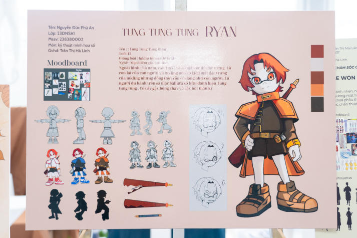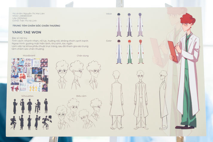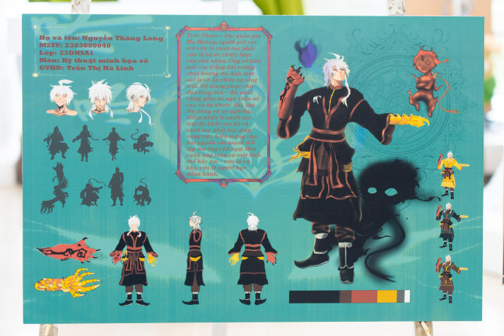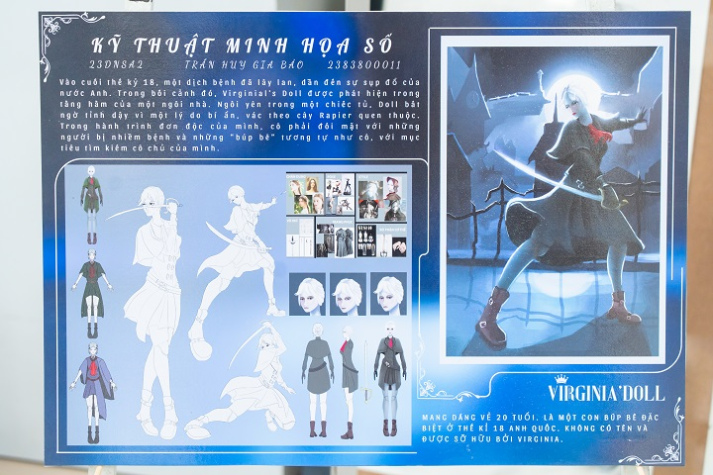 Trong số các đồ án trưng bày, sinh viên Nguyễn Thị Thùy Trang tạo ấn tượng mạnh với nhân vật “Quản gia mèo Sinon”. Nhân vật được tạo hình duyên dáng, ánh mắt sắc sảo và trang phục mang hơi hướng quý tộc được trau chuốt đến từng chi tiết, kết hợp cùng phụ kiện đặc trưng tạo nên diện mạo vừa sang trọng vừa bí ẩn. Sự chỉn chu trong biểu cảm và thần thái giúp nhân vật toát lên cá tính riêng, đồng thời chiều sâu tâm lý và câu chuyện nền được xây dựng nhất quán đã khiến “Quản gia mèo Sinon” được đánh giá rất cao.