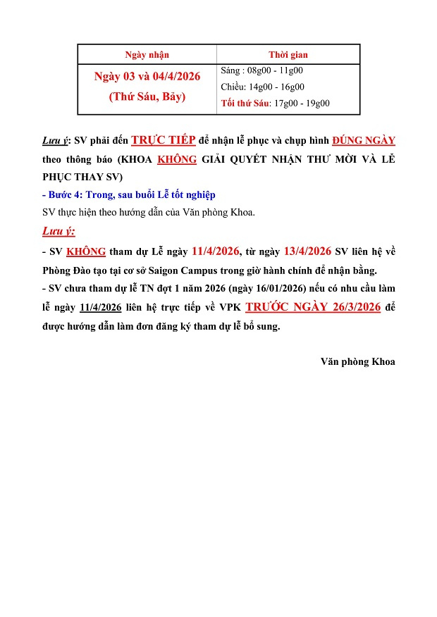[THÔNG BÁO] Điều chỉnh thời gian nhận lễ phục và chụp ảnh tham dự Lễ trao bằng tốt nghiệp ngày 16/01/2026