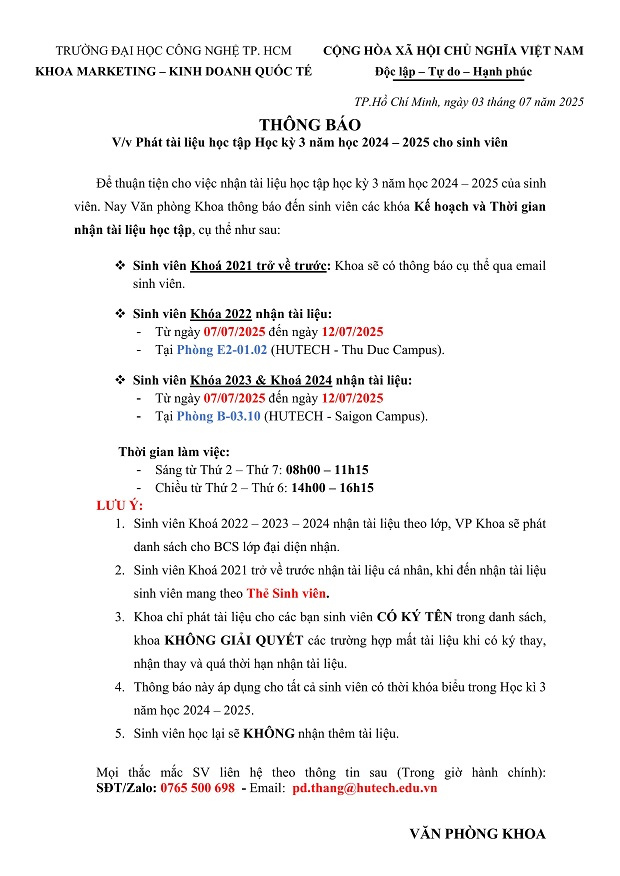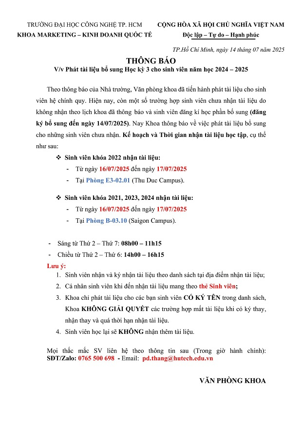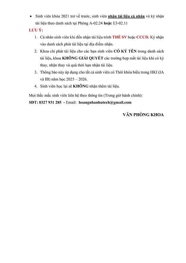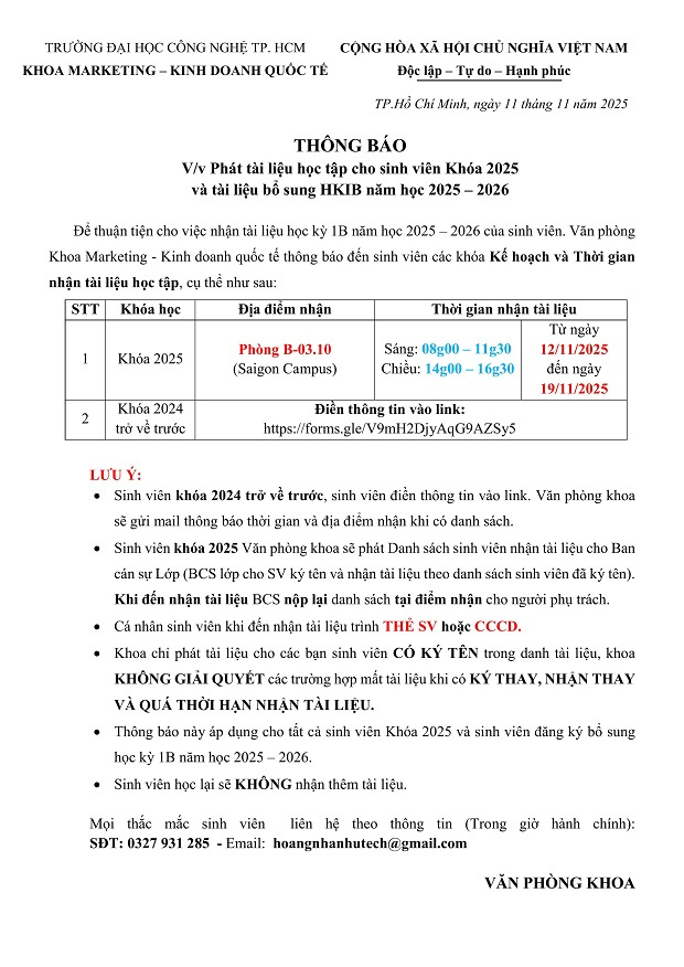 [THÔNG BÁO] Phát tài liệu học tập cho sinh viên khoá 2025 & Tài liệu bổ sung HK1B năm học 2025 - 2026 cho sinh viên * Sinh viên khoá 2024 trở về trước điền thông tin TẠI ĐÂY để nhận tài liệu các học phần đăng ký bổ sung trong Học kỳ 1B và Học kỳ phụ HK1 năm học 2025 - 2026.
