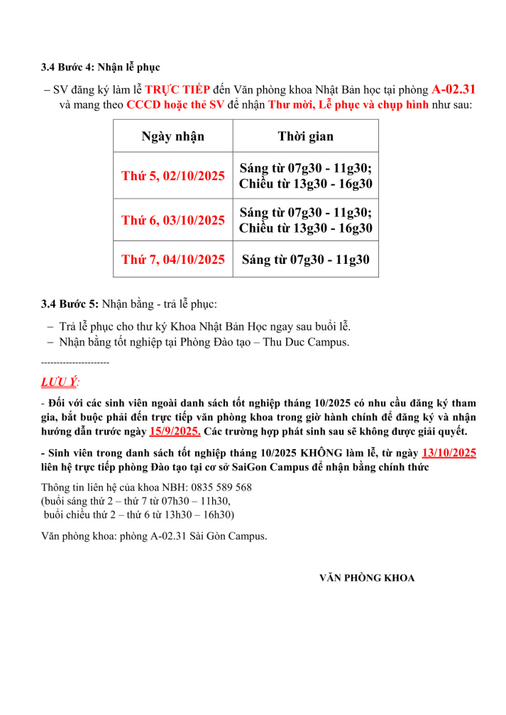 Đăng ký tham gia lễ tốt nghiệp Sáng thứ Bảy ngày 11/10/2025 của sinh viên khoa Nhật Bản học