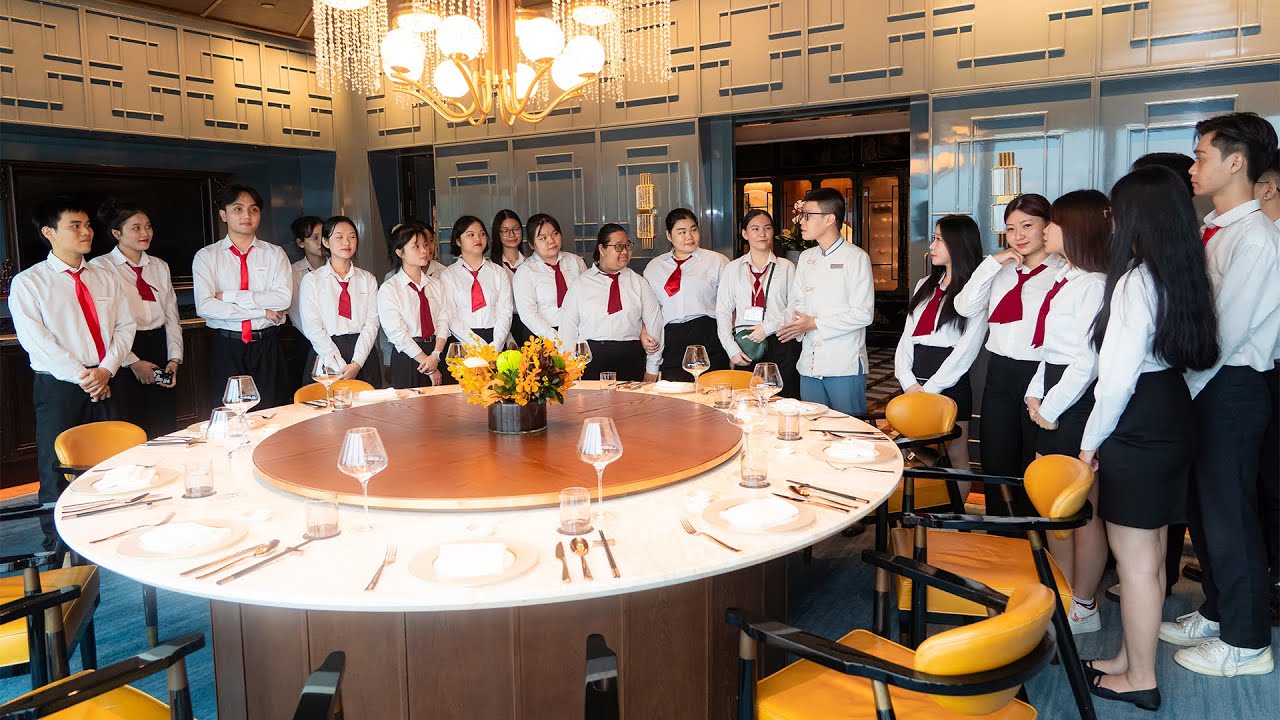 Sinh viên được trải nghiệm nhiều hạng phòng khác nhau như Deluxe River View, Deluxe Corner Suite, King Guest Room, King Guest Room và Premium Suite có diện tích lên đến 110m². Bên cạnh đó, đoàn còn được giới thiệu các khu vực tiện ích nổi bật gồm nhà hàng Hoa tại tầng 39, nhà hàng Âu - Á tại tầng 10, hồ bơi ngoài trời và phòng gym hiện đại. Với phong cách thiết kế tinh tế cùng tiêu chuẩn dịch vụ quốc tế, Hilton Saigon mang đến ấn tượng mạnh mẽ về môi trường làm việc đẳng cấp, nơi sự chuyên nghiệp và tính kỷ luật được thể hiện trong từng khâu vận hành.