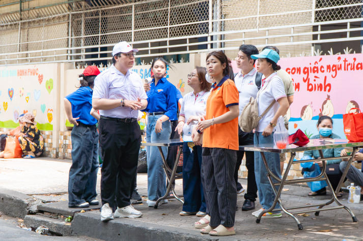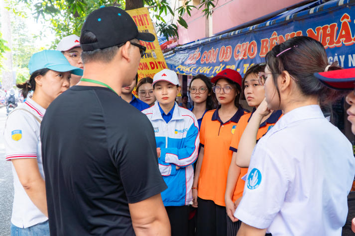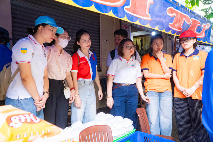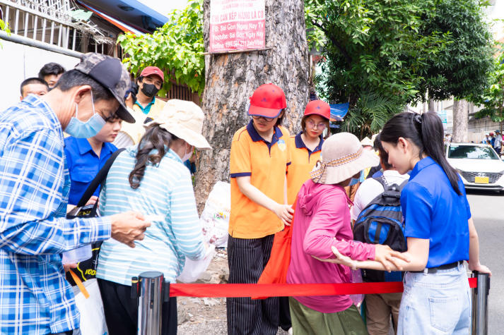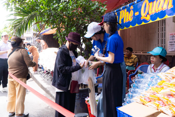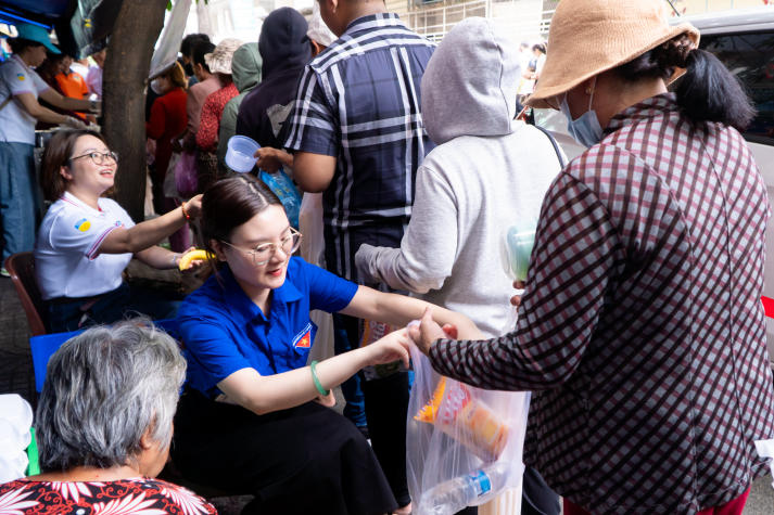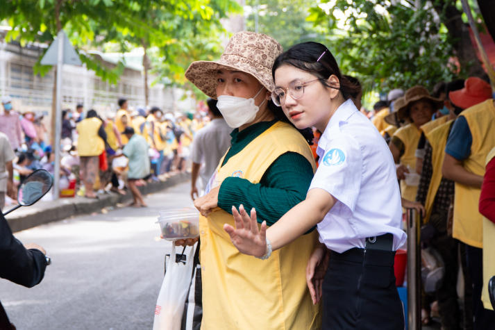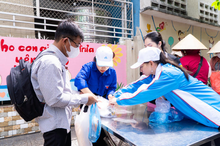 Không dừng lại ở việc trao những phần ăn nghĩa tình, các bạn còn hăng hái tham gia vào nhiều công tác hỗ trợ và tổ chức. Tại các điểm phát, sinh viên đảm nhiệm vai trò điều phối, hướng dẫn người nhận xếp hàng trật tự, giữ gìn an ninh khu vực; hỗ trợ bệnh nhân và người lớn tuổi di chuyển an toàn đến nơi nhận cơm. Đồng thời, các bạn cũng hướng dẫn người nhận mở và đậy nắp hộp cơm đúng cách để đảm bảo vệ sinh và an toàn thực phẩm.