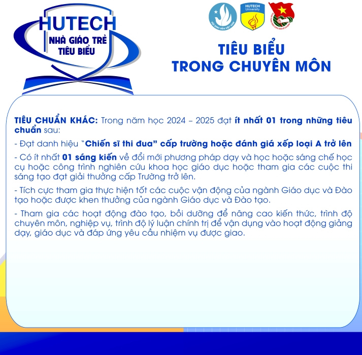 Mời quý thầy cô HUTECH thuộc nhóm đối tượng bình xét, đáp ứng đủ tiêu chuẩn sau đây, cùng đăng ký Bình xét danh hiệu “Nhà giáo trẻ tiêu biểu” cấp Trường năm 2025.