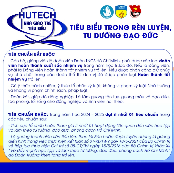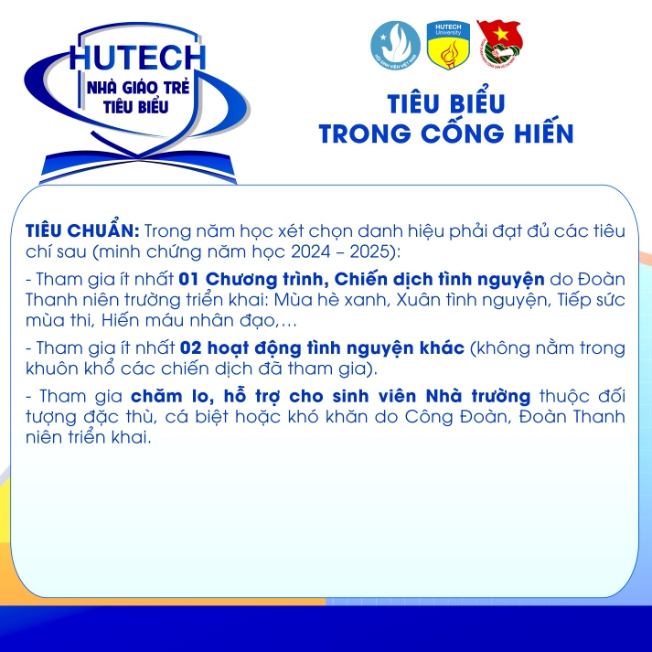 Tên gọi của danh hiệu: “Nhà giáo trẻ tiêu biểu Trường Đại học Công nghệ TP.HCM” năm 2025. Đối tượng: Cán bộ, Giảng viên từ 35 tuổi trở xuống đang công tác tại HUTECH. Mốc thời gian đăng ký, bình xét, công bố và tuyên dương: