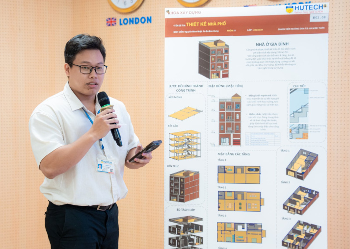 Các sản phẩm của sinh viên được trình bày dưới hình thức standee trực quan, thể hiện đầy đủ các nội dung về quy mô công trình; lược đồ hình thành công trình với các yếu tố gồm nền móng, kết cấu, kiến trúc; mặt đứng,mặt bằng các tầng, mặt cắt và hình phối cảnh.