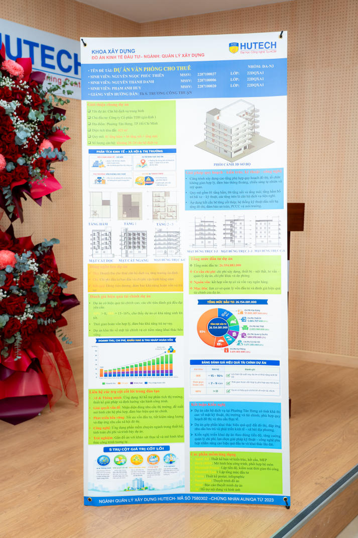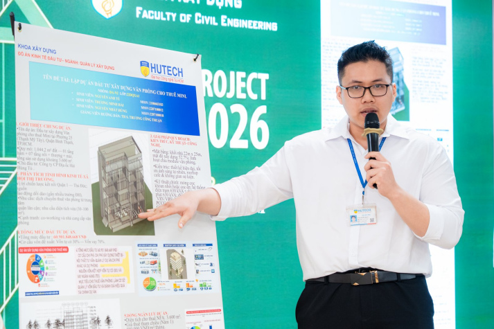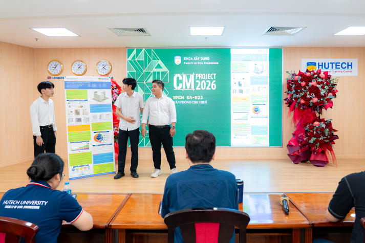 Ngày 13/01/2026, Khoa Xây dựng Trường Đại học Công nghệ TP.HCM (HUTECH) tổ chức Triển lãm đồ án học phần Kinh tế đầu tư - một phần trong chuỗi hoạt động CM-Project 2026 dành cho sinh viên ngành Quản lý xây dựng. Thông qua triển lãm, sinh viên không chỉ trưng bày sản phẩm học tập, mà còn trực tiếp bảo vệ ý tưởng, phương án kinh tế, kỹ thuật và năng lực triển khai dự án trước hội đồng chuyên môn.