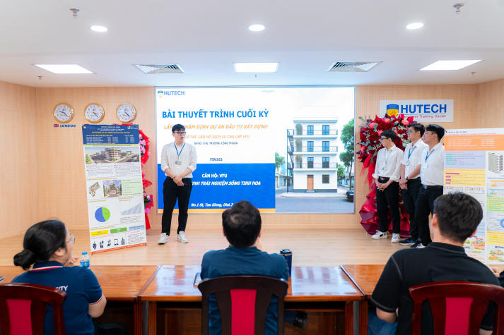 Ban Giám khảo đã theo dõi, đặt câu hỏi và góp ý dựa trên các tiêu chí về tính thực tiễn, độ tin cậy của số liệu, bố cục trình bày, tính thẩm mỹ và khả năng ứng dụng. Những phản biện chuyên môn này giúp sinh viên nhìn nhận rõ điểm mạnh, hạn chế và điều chỉnh đồ án theo hướng tiệm cận yêu cầu của thị trường. Kết quả, giải Xuất sắc thuộc về nhóm dự án Căn hộ dịch vụ cao cấp VFU và giải Poster đẹp được trao cho nhóm Dự án văn phòng cho thuê.