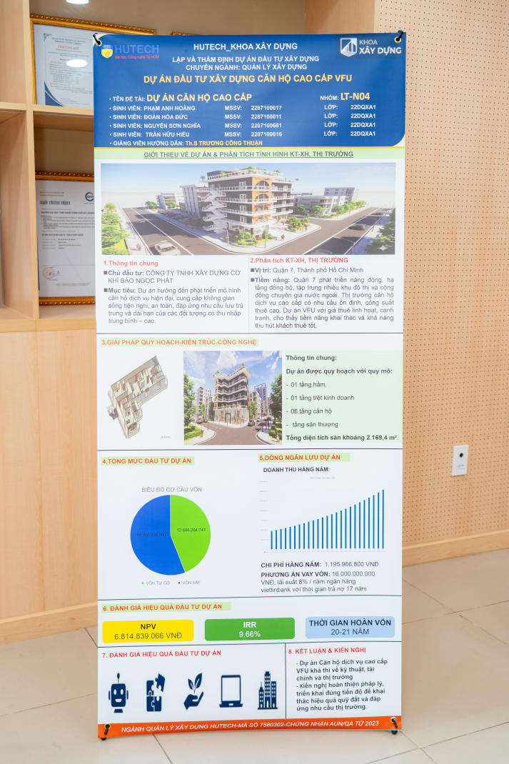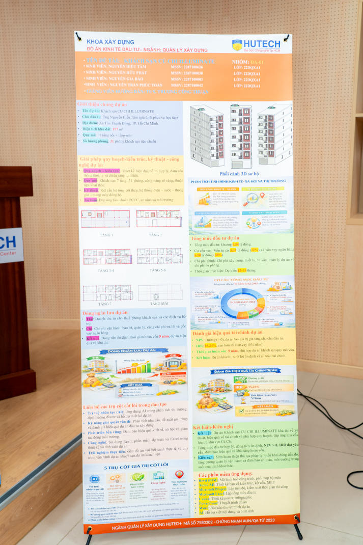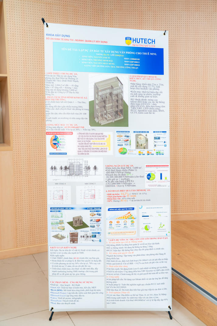 Tại triển lãm, sinh viên đã giới thiệu 04 dự án đầu tư xây dựng gồm: Khách sạn Củ Chi ILLUMINATE, Văn phòng cho thuê mini, Dự án văn phòng cho thuê và Căn hộ dịch vụ cao cấp VFU. Mỗi nhóm có 10 phút trình bày, làm rõ ý tưởng, phương án kinh tế - kỹ thuật và trực tiếp phản biện trước Ban Giám khảo. Các dự án cho thấy sự vận dụng tổng hợp kiến thức, khả năng tư duy phản biện, kỹ năng trình bày và mức độ tiếp cận sát với thực tế nghề nghiệp.