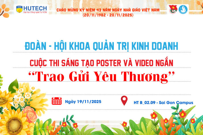 1 Cuộc thi học thuật Chào mừng Ngày Nhà giáo Việt Nam 20/11, chủ đề “Trao gửi lời yêu thương do Khoa Quản trị kinh doanh tổ chức. Diễn ra từ ngày 05/11 đến hết ngày 14/11. Vòng chung kết 18h00, ngày 19/11 tại B-02.09, Sai Gon Campus.