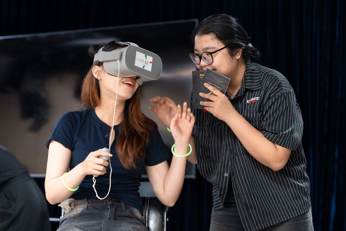 Ở khu vực Virmo City - trải nghiệm thực tế ảo cùng kính VR và Apple Vision Pro, người tham gia được trải nghiệm một lối xem phim mới mẻ, không chỉ kích thích về thị giác mà còn tạo cảm giác chân thực như đang được ngay bên trong từng cảnh quay. Đến với 3Depth City và Cine.Exe City, sinh viên thưởng thức tuyển tập phim có sự tham gia sản xuất bởi AI, phim công nghệ 3D.
