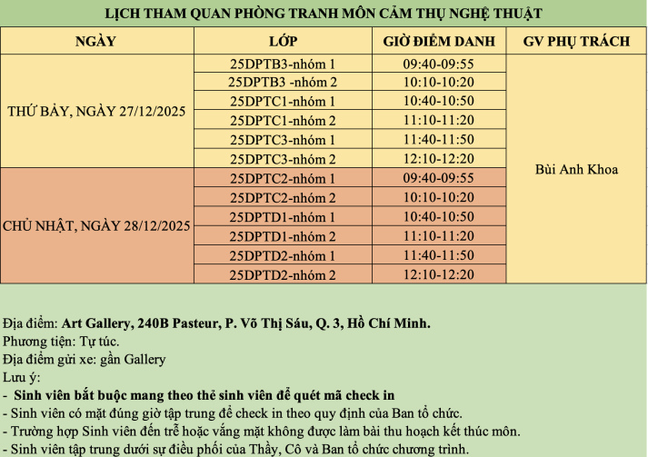LỊCH XEM PHIM MÔN CẢM THỤ NGHỆ THUẬT