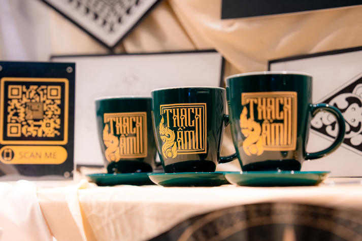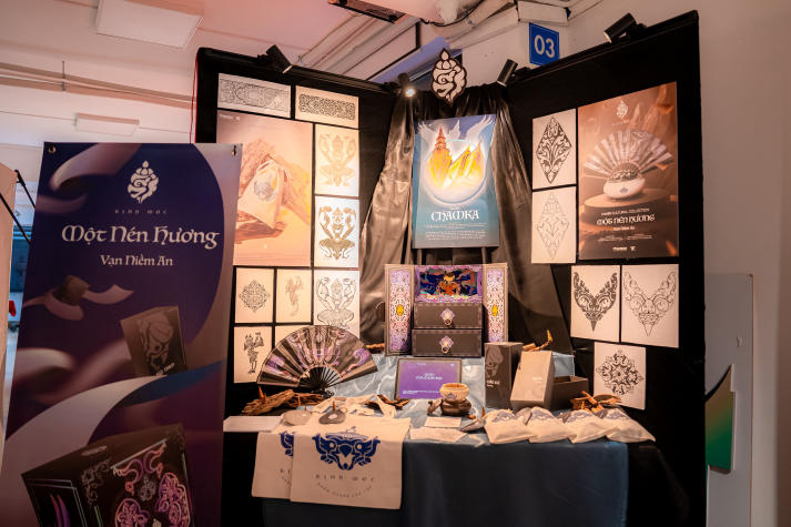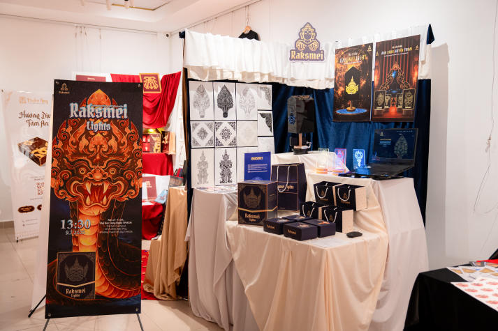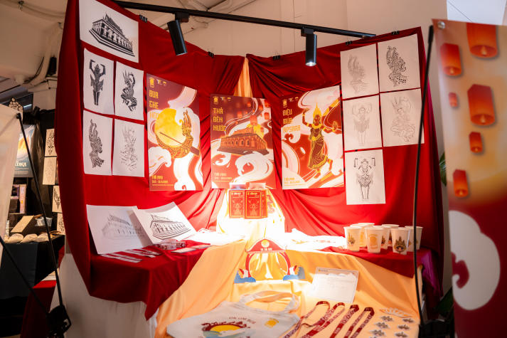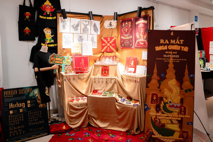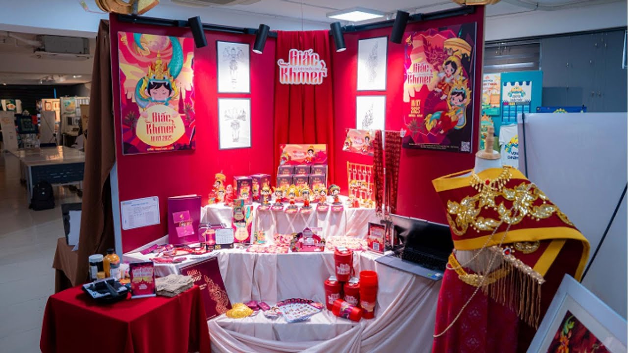 Trong khi đó, “Giấc Khmer” tái hiện không khí lễ hội đặc trưng qua bộ nhận diện thương hiệu và bao bì cho các sản phẩm tiêu dùng như mứt, trà, bánh, gia vị. Một trong những điểm nhấn của đồ án là bộ trang phục truyền thống được thiết kế từ lụa gấm đỏ ánh kim, ứng dụng các họa tiết được sinh viên phục dựng từ chuyến đi thực tế. Không gian trưng bày rực rỡ sắc màu, kết hợp với các ấn phẩm truyền thông như poster, sổ tay, standee theo phong cách minh họa hiện đại.