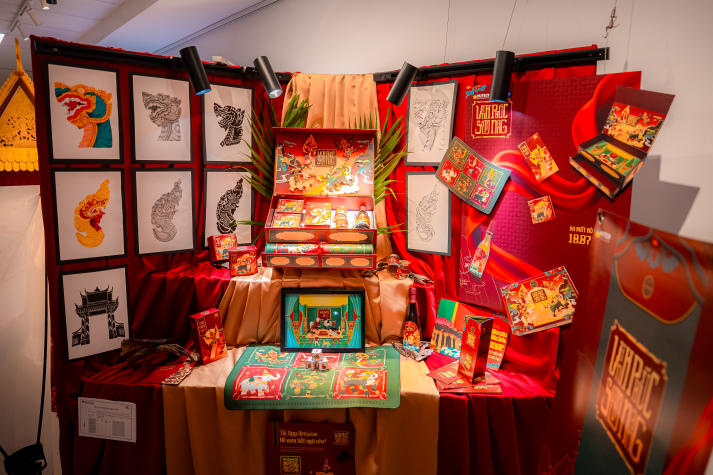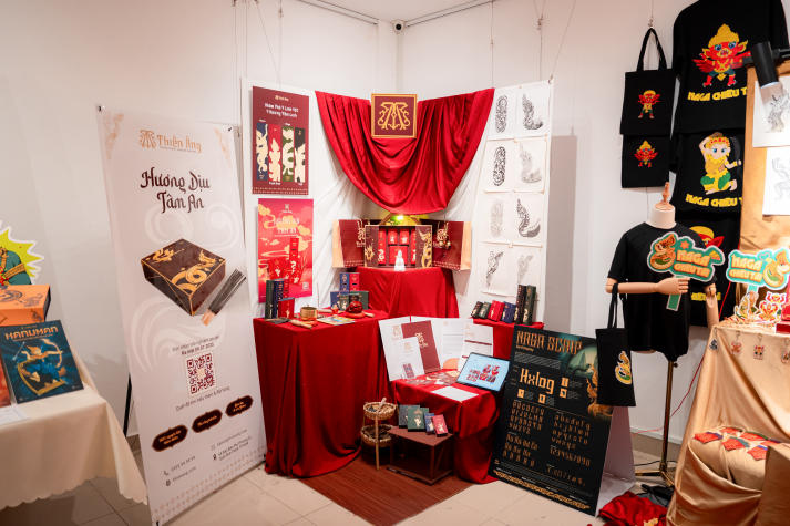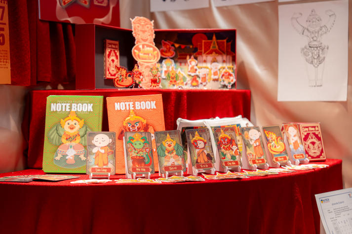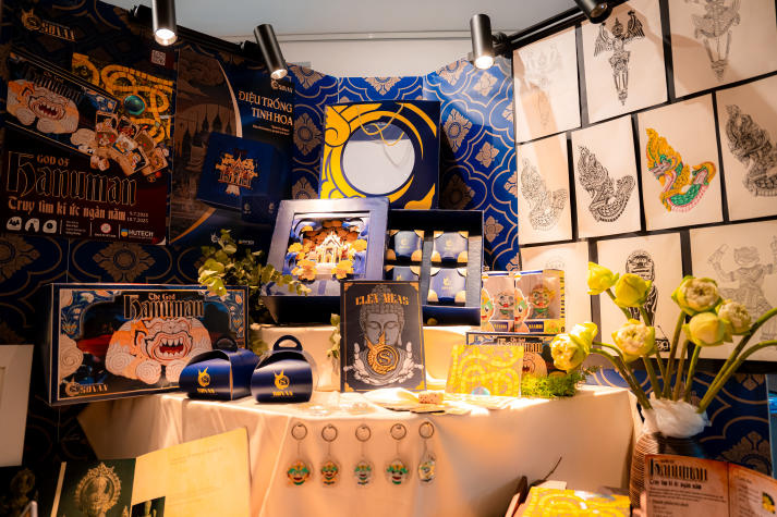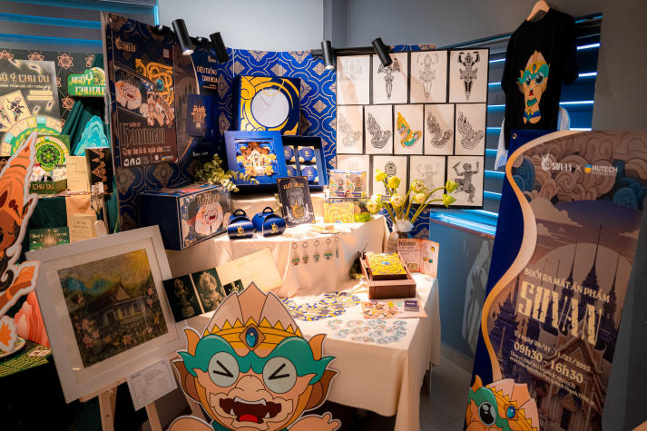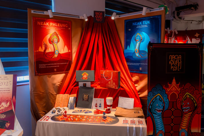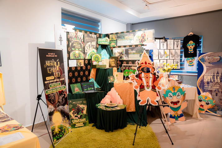 Nhiều đồ án gây ấn tượng mạnh không chỉ bởi tính thẩm mỹ mà còn ở chiều sâu văn hóa. Như “Linh Ấn” - boardgame khai thác thế giới tâm linh của người Khmer. Trò chơi mô phỏng hành trình giải nghiệp và thu thập linh ấn thông qua các thử thách mang màu sắc huyền bí. Không gian trưng bày được thiết kế như một ngôi miếu thu nhỏ với mái cong cách điệu, màu đỏ sẫm và vàng kim chủ đạo. Các chi tiết như thẻ bài, đồng xu, mô hình nhân vật đều được chế tác công phu, mang lại trải nghiệm hấp dẫn cho người tham quan.