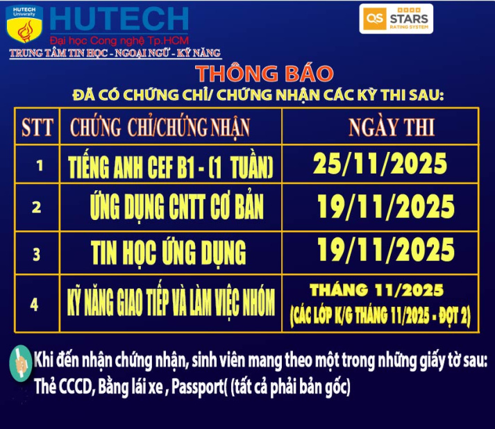 Thông báo đã có chứng chỉ/chứng nhận các kỳ thi cập nhật 13/11/2025