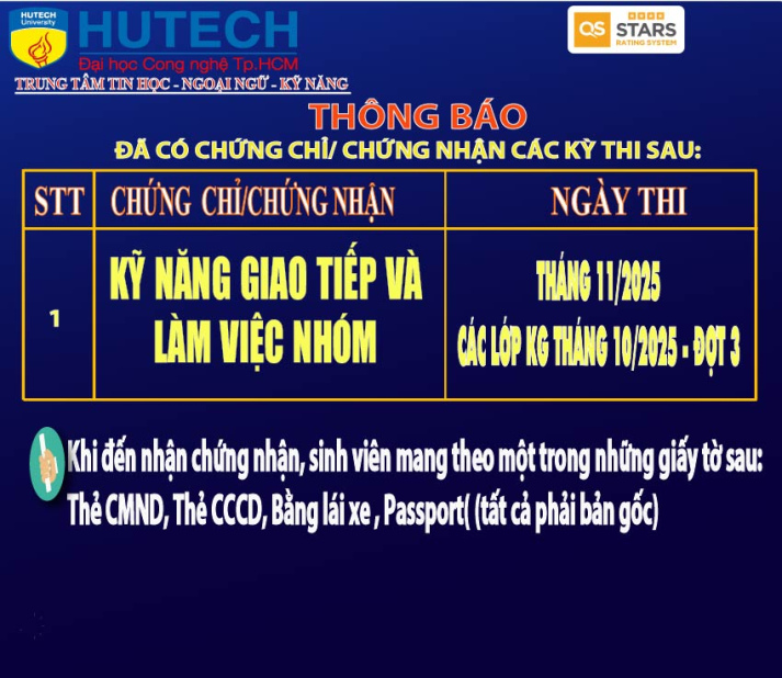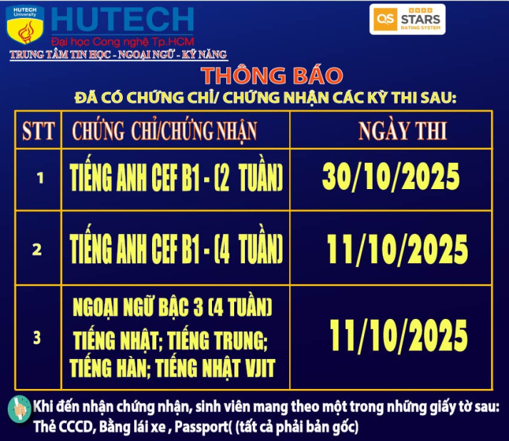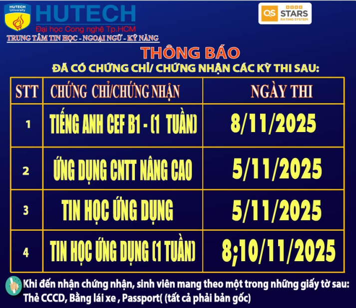Thông báo đã có chứng chỉ/chứng nhận các kỳ thi cập nhật 13/11/2025