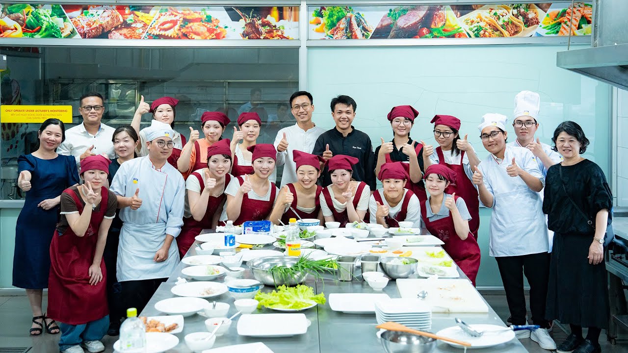 Điểm nhấn đặc biệt của chương trình là hoạt động Cooking Class, nơi sinh viên hai trường cùng trực tiếp chế biến các món ăn truyền thống Việt Nam như gỏi cuốn, chả giò và chè khoai dưới sự hướng dẫn của thầy Trần Lê Thanh Thiện - giảng viên Khoa Quản trị Du lịch - Nhà hàng - Khách sạn. Thông qua hoạt động này, sinh viên không chỉ học cách chế biến món ăn, mà còn hiểu sâu hơn về ý nghĩa văn hóa, nguyên liệu và phong cách trình bày trong ẩm thực Việt, từ đó cảm nhận rõ nét giá trị của văn hóa thông qua trải nghiệm thực hành.